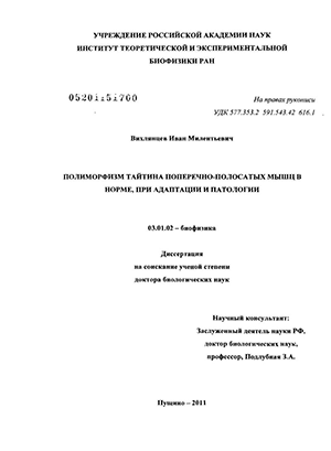 Разработан метод ДСН-электрофореза в крупнопористом горизонтальном геле и модифицированы известные методы ДСН-электрофореза в вертикальных гелях для исследования полиморфизма гигантского белка тайтина. С помощью этих методов получены новые данные, показывающие, что в поперечно-полосатых мышцах млекопитающих наряду с известными N2A-, N2BA- и №В-изоформами тайтина присутствуют более высокомолекулярные изоформы этого белка. Проведено сравнительное исследование вклада изменений изоформного состава тайтина в изменения структурно-функциональных свойств в мышцах млекопитающих при адаптации к экстремальным условиям среды (гибернация, микрогравитация) и при развитии патологических процессов (гипертрофия сердечной мышцы, дилатационная кардиомиопатия, синдром «ригидного человека»). В поперечнополосатых мышцах зимоспящих сусликов Spermophilus undulatus в период гибернации обнаружено уменьшение содержания известных изоформ тайтина при сохранении содержания новых, более высокомолекулярных изоформ этого белка. Обнаруженные изменения в содержании тайтина не сопровождались нарушением структурно-функциональных свойств мышц гибернирующих животных. Сделано заключение об адаптационном значении сохранения в мышцах гибернирующих сусликов более высокомолекулярных изоформ тайтина для поддержания упорядоченной структуры миофибриллярного аппарата и необходимого уровня сократительной активности мышц при спячке и пробуждении, что способствует выходу животного из состояния гибернации без патологических последствий. В мышцах человека и животных при развитии патологических процессов и в m. soleus человека и крысы при развитии «гипогравитационного мышечного синдрома» наряду с уменьшением содержания известных изоформ тайтина обнаружено разрушение более высокомолекулярных изоформ этого белка, что сопровождалось нарушением структурно-функциональных свойств мышц. Сделано заключение о том, что главную роль в поддержании структурно-функциональных характеристик мышц играют открытые нами более высокомолекулярные изоформы тайтина, а не N2A-, N2BA- и N2B-изоформы этого белка.