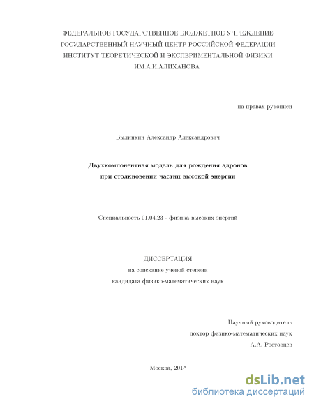 Былинкин Александр Александрович. Двухкомпонентная модель для рождения адронов при столкновении частиц высокой энергии: диссертация ... кандидата физико-математических наук: 01.04.23 / Былинкин Александр Александрович;[Место защиты: Институт Теоретической и Экспериментальной Физики - ФГБУ ГНЦ РФ НИЦ "Курчатовский институт"].- Москва, 2014.- 89 с.