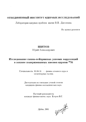 Шитов Юрий Александрович. Исследование гамма-нейтринных угловых корреляций в захвате поляризованных мюонов ядрами 28 Si : диссертация ... кандидата физико-математических наук : 01.04.16.- Дубна, 2001.- 102 с.: ил. РГБ ОД, 61 01-1/915-9