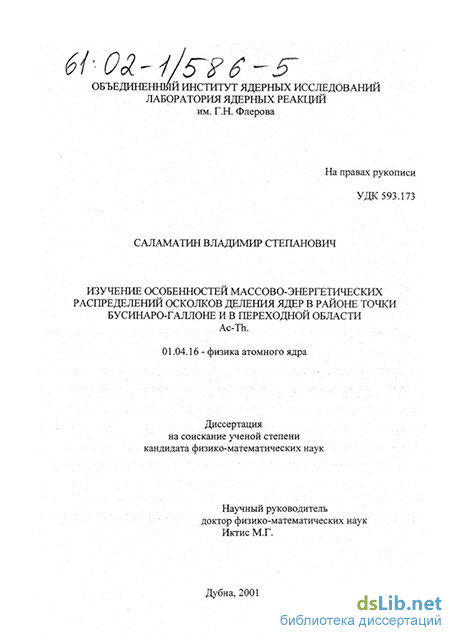 Саламатин Владимир Степанович. Изучение особенностей массово-энергетических распределений осколков деления ядер в районе точки Бусинаро-Галлоне и в переходной области Ac-Th : диссертация ... кандидата физико-математических наук : 01.04.16.- Дубна, 2001.- 94 с.: ил. РГБ ОД, 61 02-1/586-5