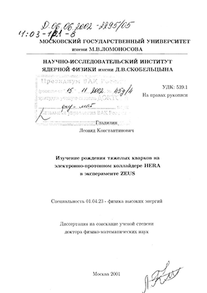 Гладилин Леонид Константинович. Изучение рождения тяжелых кварков на электронно-протонном коллайдере HERA в эксперименте ZEUS : диссертация ... доктора физико-математических наук : 01.04.23.- Москва, 2001.- 192 с.: ил. РГБ ОД, 71 03-1/21-0
