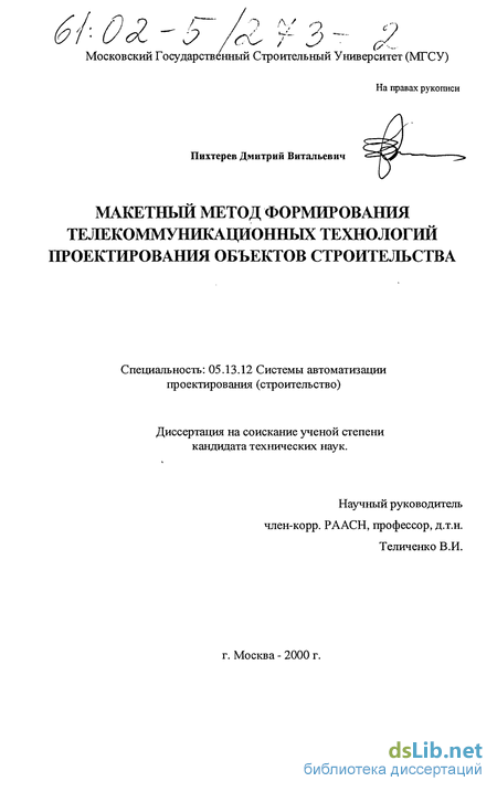 Цель диссертации; разработка метода формирования телекоммуникационных технологий проектирования объектов строительства на различных стадиях жизненного цикла на основе применения стандартов CALS-технологий, компьютерных программно-технических средств автоматизации проектирования и стандартных телекоммуникационных каналов передачи данных в информационной среде проектирования.