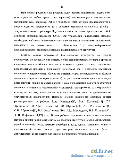 Методы оценки показателей безотказности базируются на теории вероятности, но поскольку они связаны с большой размерностью задач и другими специфическими особенностями как в исходных данных (тесное сопряжение вероятностных моделей и физических процессов), так и в целевых расчетных величинах (специфические, обычно не очевидные для неспециалистов в области надежности термины и характеристики), то уже давно выделились в отдельную ветвь научных знаний со своей школой. Также проблематика расчета показателей надежности связана со сложившейся структурой государственных и отраслевых стандартов, поэтому иностранные методики в чистом виде не применимы на отечественных предприятиях. Вопросы оценки надежности сложных систем рассматривались в работах И.А. Ушакова[1], Б.А. Козлова[2,3], Г.В. ДрЗж, н, на [4], A.M. Половко [5], СВ. ГЗрова [5,6], А.с. Рез, новского[8], О.В. Абрамова[9], В.А. Каш2анова [10], А.И. Медведева, В.В Л, паева[11], Ю.Н. Кофанова[11,12] и др. В этих работах описывается несколько основных методов оценки надежности систем со сложной структурой (метод минимальных путей и сечений, метод прямого перебора и т.п.), однако основным является аналитический метод расчета, при котором выводятся строгие (или с допущениями) соотношения для каждой конкретной структуры изделия.