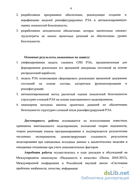 Апробация работы осуществлялась в ходе докладов и обсуждений на Международном симпозиуме «Надежность и качество» (Пенза, 2010-2013), Международной конференции и Российской научной школе «Системные проблемы надёжности, качества, информационных и электронных технологий» - ИННОВАТИКА (Сочи, 2010-2011), Международной студенческой школе-семинаре «Новые информационные технологии» (Судак, 2010-2013), Всероссийской конференции «Современные проблемы радиоэлектроники» (Красноярск, 2011-2013), II Всероссийской научно-технической конференции «Радиовысотометрия» (г. Каменск-уральский, 2010), Научно-технической конференции студентов, аспирантов и молодых специалистов МИЭМ (Москва, 2010-2013), II Всероссийской научно-технической конференции «Системы управления беспилотными космическими и атмосферными летательными аппаратами» (Москва, 2012), Международной научно-практической конференции «Инновационные информационные технологии» (Прага, 2012), научном семинаре «Надежность и качество функционирования систем» (Москва, 2012), X Всероссийской научно-технической конференции «Научные чтения по авиации, посвященные памяти профессора Н.Е. Жуковского» (Москва, 2013), что подтверждает актуальность проведенного исследования и достоверность его результатов.