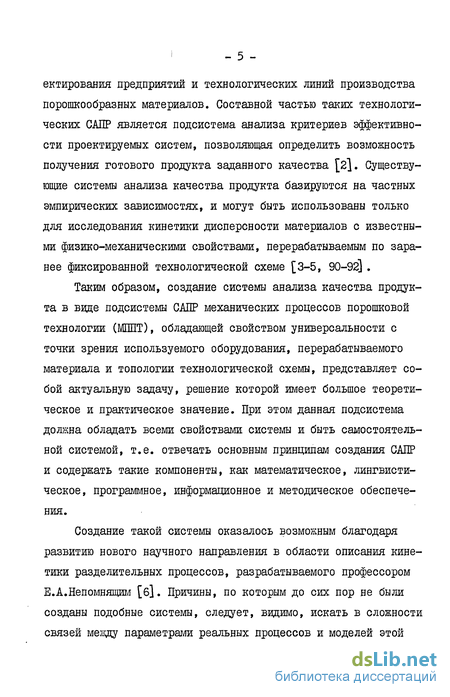 В связи с этим в нашей стране и за рубежом проявляется повышенный интерес к созданию систем автоматизированного про- і - 5 - ектирования предприятий и технологических линий производства порошкообразных материалов. Составной частью таких технологических САПР является подсистема анализа критериев эффективности проектируемых систем, позволяющая определить ВОЗМОЖНОСТЬ получения готового продукта заданного качества [2]. Существующие системы анализа качества продукта базируются на частных эмпирических зависимостях, и могут быть использованы только для исследования кинетики дисперсности материалов с известными физико-механическими свойствами, перерабатываемым по заранее фиксированной технологической схеме [3-5, 90-92] .