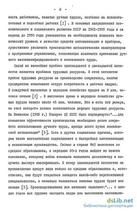 Переход к мало операционным технологиям и создание высокоэффективного и высокопроизводительного оборудования невозможны без подъема технической вооруженности труда. В текущей пятилетке всемерно внедряется комплексная механизация и автоматизация производственных процессов, сокращается во всех отраслях числен - 6 ность работников, занятых ручным трудом, особенно на вспомогательных и подсобных работах [і] . В основных направлениях экономического и социального развития СССР на І98І-І985 годы и на период до 1990 года указывается на необходимость повысить технический уровень и качество средств автоматизации и приборов, существенно увеличить производство автоматических манипуляторов с программным управлением, позволяющих исключить применение ручного малоквалифицированного и монотонного труда.