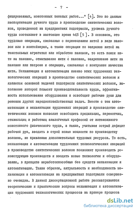Одной из важнейших проблем одиннадцатой и двенадцатой пятилеток является проблема трудовых ресурсов. В этой пятилетке приток трудовых ресурсов на производство сократился, многие предприятия испытывают острую потребность в рабочих кадрах. В следующей пятилетке в народное хозяйство придет на 8 млн. человек меньше [2] . В настоящее время в народном хозяйстве ручным трудом занято около 4-5 млн. человек. Это и есть тот резерв, за счет которого должен восполняться дефицит трудовых ресурсов. На Июньском (1983 г.) Пленуме ЦК КПСС было подчеркнуто:"...для повышения эффективности производства необходимо резко сократить использование ручного труда, прежде всего путем комплексной механизации" [з]. Есть и другая социальная причина, которая также настоятельно подталкивает к быстрейшей автоматизации и механизации производства. Сейчас в стране 8Ь% населения со средним образованием, в середине 80-х годов выйдет на пенсию поколение, которому война помешала закончить десятилетку и получить высокую квалификацию. К концу одиннадцатой пятилетки на производство придут люди только со средним образованием и, естественно, они будут стараться овладеть какой-либо перспективной специальностью, а желающих заниматься тяжелым трудом будет все меньше [3]. Производственники все активнее заявляют:"... с каждым годом все труднее находить кадры для выполнения малоквали - 7 фицированных, монотонных тяжелых работ..." [V]. Это по данным паспортизации ручного труда в производстве синтетических волокон, проведенной на предприятиях подотрасли, уровень ручного труда составляет в настоящее время Ц-6% [5 ]. В основном, это трудовые операции, связанные с перемещением нитей в виде паковок или в контейнерах, а также операции по заправке нитей на текстильных агрегатах или обработке паковок, то есть поиск нити на паковке, отматывание нити с паковки, закрепление нити на паковке или патроне и операции, связанные с контролем качества нити. Механизация и автоматизация именно этих трудоемких технологических операций в производстве синтетических волокон и является основной задачей подотрасли синтетических волокон, выполнение которой повысит производительность труда, эффективность использования оборудования и освободит рабочие руки для решения других народнохозяйственных задач. Вместе с тем автоматизация и механизация трудоемких операций в производстве синтетических волокон позволит освободить прядильщиц, перемотчиц, ставильщиц и работниц аналогичных профессий от интенсивного монотонного физического труда, а также, учитывая острый дефицит рабочих рук, вводить в строй новые мощности по производству волокна, не привлекая дополнительных трудовых ресурсов. То есть, механизация и автоматизация трудоемких технологических операций в производстве синтетических волокон позволяют производить реконструкцию производств и вводить новые технологии и оборудование, в принципе неработоспособные без средств механизации и автоматизации. Таким образом, актуальность и необходимость механизации и автоматизации на предприятиях подотрасли совершенно очевидна. В данной диссертационной работе рассматриваются теоретические и практические вопросы механизации и автоматизации трудоемких технологических процессов на примере процесса