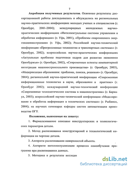 Апробация полученных результатов. Основные результаты диссертационной работы докладывались и обсуждались на региональных научно-практических конференциях молодых ученых и специалистов (г. Оренбург, 2001-2004); международных молодежных научно-практических конференциях «Интеллектуальные системы управления и обработки информации» (г. Уфа, 2001), «Проблемы современного энергомашиностроения» (г. Уфа, 2002); Российской научно-технической конференции «Прогрессивные технологии в транспортных системах» (г. Оренбург, 2002); всероссийских научно-практических конференциях «Актуальные проблемы подготовки кадров для развития экономики Оренбуржья» (г. Оренбург, 2002), «Современные аспекты компьютерной интеграции машиностроительного производства» (г. Оренбург, 2003), «Модернизация образования: проблемы, поиски, решения» (г. Оренбург, 2004); региональной научно-практической конференции «Современные информационные технологии в науке, образовании и практике» (г. Оренбург 2002); международной научно-технической конференции «Современные технологические системы в машиностроении» (г. Барнаул, 2003); всероссийской научно-технической конференции «Моделирование и обработка информации в технических системах» (г. Рыбинск, 2004); на научных семинарах кафедры систем автоматизации производства ОГУ.