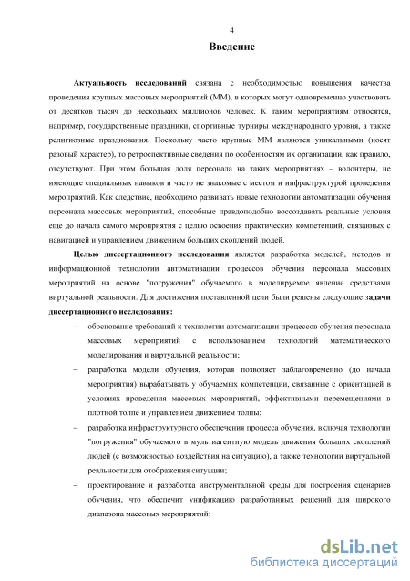 Целью исследования является разработка моделей, методов и средств автоматизации процессов обучения персонала ММ на основе технологий виртуальной реальности и компьютерного моделирования движения больших скоплений людей.
