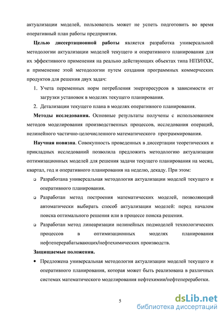 Целью диссертационной работы является разработка универсальной методологии актуализации моделей текущего и оперативного планирования для их эффективного применения на реально действующих объектах типа НПЗ/НХК, и применение этой методологии путем создания программных коммерческих продуктов для решения двух задач: