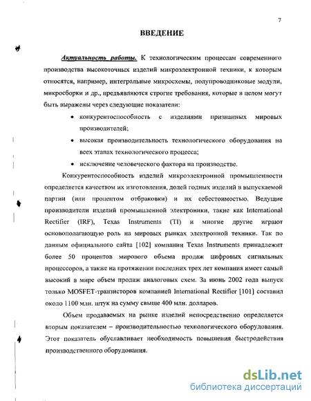 определяется качеством их изготовления, долей годных изделий в выпускаемой партии (или процентом отбраковки) и их себестоимостью. Ведущие производители изделий промышленной электроники, такие как International Rectifier (IRF), Texas Instruments (ТІ) и многие другие играют основополагающую роль на мировых рынках электронной техники. Так по данным официального сайта [102] компании Texas Instruments принадлежит более 50 процентов мирового объема продаж цифровых сигнальных процессоров, а также на протяжении последних трех лет компания имеет самый высокий в мире объем продаж аналоговых схем. За июнь 2002 года выпуск только MOSFET-транзисторов компанией International Rectifier [101] составил около 1100 млн. штук на сумму свыше 400 млн. долларов.