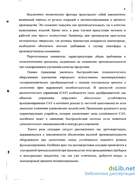Такого рода ситуацию следует рассматривать как противоречивую, выражающуюся в невозможности обеспечения высокой производительности оборудования при достаточном запасе устойчивости заданного режима функционирования. Особенно ярко эта противоречивая ситуация проявляется в электронной промышленности при производстве полупроводниковых приборов и интегральных микросхем, где, как уже отмечалось, требуется микро- и нанометровый диапазон позиционирования.