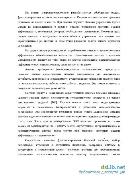 Вне зависимости от разбиения конкретного технологического процесса на подсистемы, при проектировании каждой из них необходимо выполнить внешнее и внутреннее проектирование. Используемые при этом методы и средства моделирования могут существенно отличаться. На стадии макропроектирования разрабатывается обобщенная модель функционирования технологического процесса. Стадию внешнего проектирования разбивают на анализ и синтез. При анализе изучают объекты управления, строят модель их взаимодействия с внешней средой, определяют критерии оценки эффективности, имеющиеся ресурсы, необходимые ограничения. Конечная цель стадии анализа - построение модели объекта управления для оценки его характеристик. При- синтезе на этом этапе решаются задачи выбора стратегии управления.