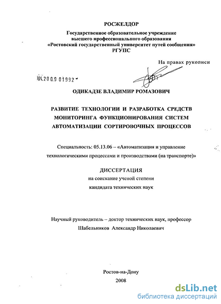 Цель диссертационного исследования – развитие технологии и разработка средств мониторинга, выявляющих данные предыдущего, текущего и прогнозного состояния системы, формирование принципов и методов поддержки принятия решений в системах управления сортировочным процессом.