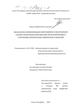 Королев Юрий Вячеславович. Технология проектирования программного обеспечения систем управления комплексами транспортировки и сортировки интегральных микросхем и модулей : диссертация ... кандидата технических наук : 05.13.06.- Санкт-Петербург, 2001.- 222 с.: ил. РГБ ОД, 61 02-5/528-6
