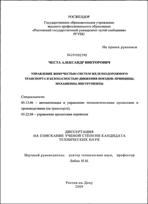 Цель диссертационного исследования – разработка принципов, механизмов и технологий обеспечения живучести систем железнодорожного транспорта и безопасности движения поездов.