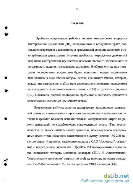 Повреждения рабочих лопаток компрессора авиационных двигателей приводят к вынужденным простоям самолетов из-за дефицита двигателей и требуют больших дополнительных материальных затрат на ремонт двигателей, не выработавших установленный ресурс. Так, восстановление Hf? авиаремонтном заводе двигателя, поврежденного посторонними предметами, обходится авиакомпании в сумму порядка 150-200 тысяч долларов. К примеру, ежегодные затраты в ОАО "Аэрофлот", связанные с повреждением двигателей Д-ЗОКУ-154 посторонними предметами, составляют четверть миллиона долларов США. В Авиакомпании "Красноярские авиалинии" затраты по этой же причине на парке самолетов ТУ-154М составляют 350 тысяч долларов США ежегодно [149].