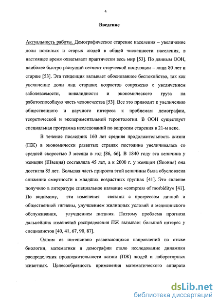 Актуальность работы. Демографическое старение населения - увеличение доли пожилых и старых людей в общей численности населения, в настоящее время охватывает практически весь мир [53]. По данным ООН, наиболее быстро растущий сегмент старческой популяции - лица 80 лет и старше [53]. Эта тенденция вызывает обоснованное беспокойство, так как увеличение доли лиц старших возрастов сопряжено с увеличением заболеваемости, инвалидности и экономического груза на работоспособную часть человечества [53]. Все это приводит к увеличению общественного и научного интереса к проблемам демографии, теоретической и экспериментальной геронтологии. В ООН существует специальная программа исследований по вопросам старения в 21-м веке.