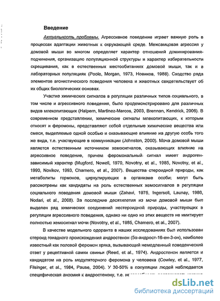 Участие химических сигналов в регуляции различных типов.социального, в том числе и агрессивного поведения, было продемонстрировано для различных видов млекопитающих (Halpern, Martinez-Marcos, 2003, Brennan, Kendrick, 2006). В современном представлении, химические сигналы млекопитающих, к которым относят и феромоны, представляют собой отдельные химические вещества или смеси, выделяемые одной особью и оказывающие влияние на другую особь того же вида, т.е. участвующие в коммуникации (Johnston, 2000). Моча домовой мыши является естественным источником хемосигналов, оказывающих влияние на агрессивное поведение, причем феромональный- сигнал имеет андроген-зависимый характер (Mugford, Nowell, 1970, Novotny, et al., 1985, Novotny, et al., 1990, Novikov, 1993, Chamero, et al., 2007). Вещества-стероидной природы, как метаболиты гормонов, циркулирующих в организме особи; могут быть рассмотрены как кандидаты на роль естественных хемосигналов в регуляции социального поведения домовой мыши (Zahavi, 1975, Ingersoll, Launay, 1986, Nodarl, et al., 2008). За последние десятилетия из мочи домовой мыши был выделен ряд химических соединений нестероидной природы, участвующих в регуляции агрессивного поведения, однако ни одно из этих веществ не имитирует полностью хемосигналмочи (Novotny, et al., 1985, Chamero, et al., 2007).