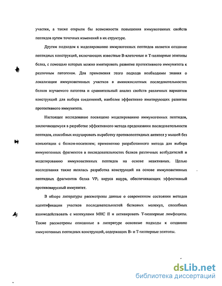 Настоящее исследование посвящено моделированию иммуногенных пептидов, заключающемуся в разработке эффективного метода предсказания последовательности пептидов, способных индуцировать выработку противопептидных антител у мышей без конъюгации с белком-носителем; применению разработанного метода для выбора иммуногенных фрагментов в последовательностях белков различных возбудителей и моделированию иммуноактивных пептидов на основе неактивных. Целью исследования также являлась разработка конструкций на основе иммуноактивных пептидных фрагментов белка VPj вируса ящура, обеспечивающих эффективный противовирусный иммунитет.