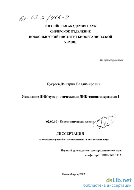 Бугреев Дмитрий Владимирович. Узнавание ДНК эукариотическими ДНК-топоизомеразами I : диссертация ... кандидата химических наук : 02.00.10.- Новосибирск, 2002.- 173 с.: ил. РГБ ОД, 61 02-2/466-9