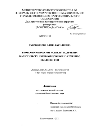 Апробация работы. Результаты научных исследований доложены и получили одобрение Региональной научно-практической конференции «Технологии производства и переработки сельскохозяйственной продукции» (Благовещенск, 2008-2009); выставке «АмурАгропрод» (Благовещенск, 2008-2010); Региональной научно-практической конференции «Молодежь 21 века: шаг в будущее» (Благовещенск, 2008-2010); Международной научно-технической конференции «Актуальные проблемы технологии живых систем» (Владивосток, 2009); Международной научно-технической конференции «Безопасность и качество товаров» (Саратов, 2009); Международной научно-технической конференции «Технология и продукты здорового питания» (Саратов, 2009); Межведомственной научно-практической конференции «Современные проблемы исследований в биологии» (Благовещенск, 2009); на международ-