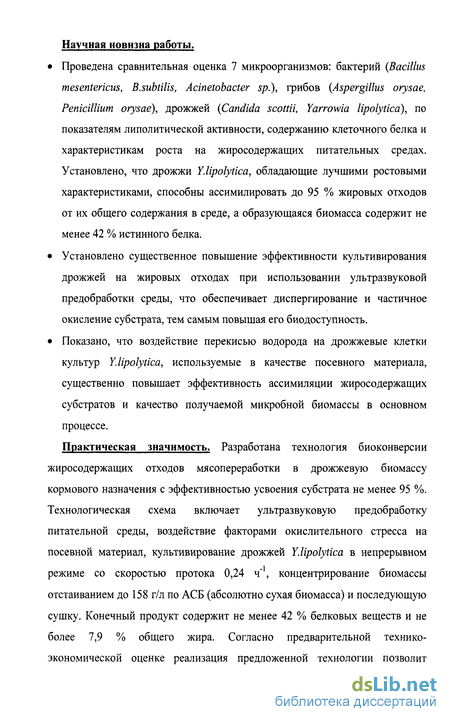 Практическая значимость. Разработана технология биоконверсии жиросодержащих отходов мясопереработки в дрожжевую биомассу кормового назначения с эффективностью усвоения субстрата не менее 95 %. Технологическая схема включает ультразвуковую предобработку питательной среды, воздействие факторами окислительного стресса на посевной материал, культивирование дрожжей Y.lipolytica в непрерывном режиме со скоростью протока 0,24 ч"1, концентрирование биомассы отстаиванием до 158 г/л по АСБ (абсолютно сухая биомасса) и последующую сушку. Конечный продукт содержит не менее 42 % белковых веществ и не более 7,9 % общего жира. Согласно предварительной технико-экономической оценке реализация предложенной технологии позволит