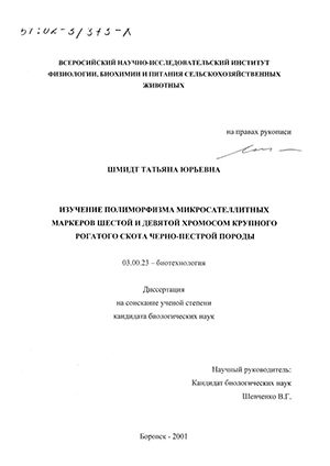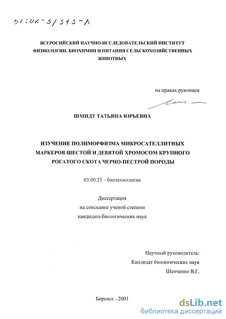 Шмидт Татьяна Юрьевна. Изучение полиморфизма микросателлитных маркеров шестой и девятой хромосом крупного рогатого скота черно-пестрой породы : диссертация ... кандидата биологических наук : 03.00.23.- Боровск, 2001.- 145 с.: ил. РГБ ОД, 61 02-3/373-X