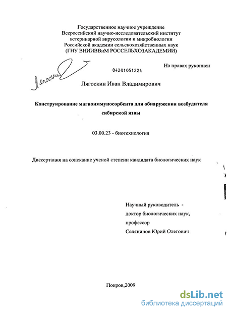 Основной объем исследований проведен автором самостоятельно. Консультативную и методическую помощь при выполнении отдельных этапов работы оказывали следующие сотрудники института: к.в.н. И.Ю. Егорова (освоение микробиологических методов), к.б.н., Е.Г. Анохина (освоение методов электрофоретического разделения белков и иммуноблоттинг), к.в.н. О.В. Капустина (освоение методов иммуноферментного анализа), к.б.н. И.В. Ногина (освоение методов мечения иммуноглобулинов ФИТЦ), д.б.н. В.Н. Пономарев (электронная микроскопия, получение магносорбентов).