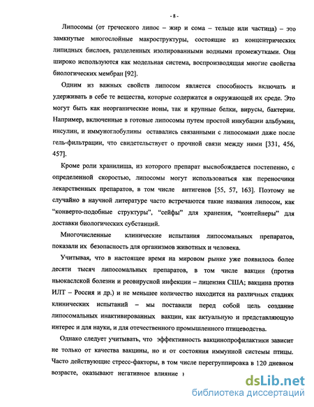 Учитывая, что в настоящее время на мировом рынке уже появилось более десяти тысяч липосомальных препаратов, в том числе вакцин (против ньюкаслской болезни и реовирусной инфекции - лицензия США; вакцина против ИЛТ - Россия и др.) и не меньшее количество находится на различных стадиях клинических испытаний - мы поставили перед собой цель создание липосомальных инактивированных вакцин, как актуальную и представляющую интерес и для науки, и для отечественного промышленного птицеводства.