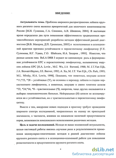 Цель и задачи исследований. Исходя из выше изложенной актуальности, целью настоящей работы явилось изучение роли и результативности применения молекулярно-генетических методов в ранней диагностике лейкоза крупного рогатого скота и в селекционно-племенной работе для повышения резистентности и продуктивности крупного рогатого скота.