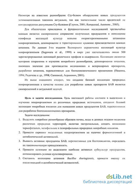 Цель и задачи псследонания. Цель настоящей работы состояла в выделении и изуче1нн1 микроорганизмов из различных природных источников, создании базовой коллекции микробных изолятов для выявления новых продуцентов БАВ, перспективных для разработок биотехнологичсских препаратов.