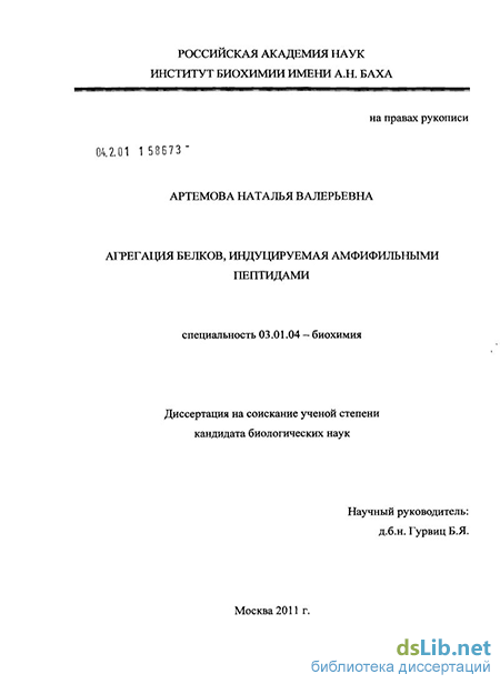 Цели и задачи работы. Целью настоящей работы является изучение молекулярных механизмов пептид-индуцируемой агрегации нативных и денатурированных модельных белковых субстратов в различных условиях. В соответствии с этой целью были поставлены следующие задачи: