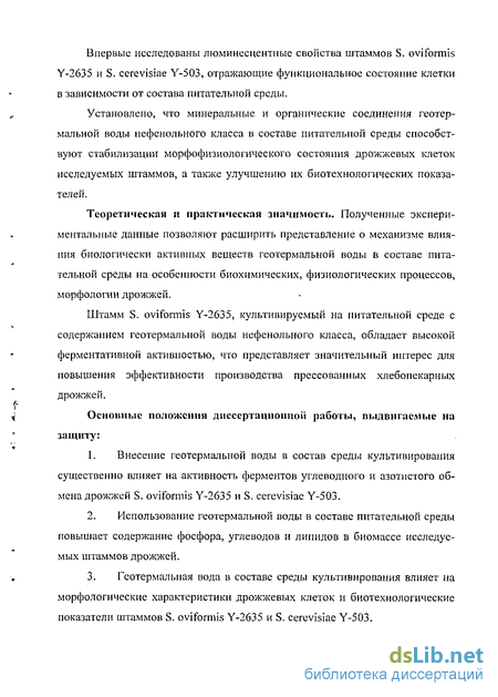 Научная новизна. Впервые установлена возможность регуляции активности ферментов гидролитического комплекса дрожжей S. oviformis Y-2635 и S. cerevisiae Y-503 биологически активными веществами геотермальной воды в составе среды культивирования.
