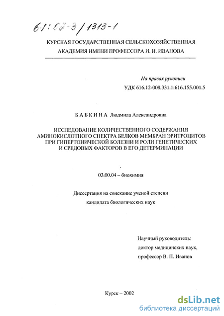 Бабкина Людмила Александровна. Исследование количественного содержания аминокислотного спектра белков мембран эритроцитов при гипертонической болезни и роли генетических и средовых факторов в его детерминации : диссертация ... кандидата биологических наук : 03.00.04.- Курск, 2002.- 166 с.: ил. РГБ ОД, 61 02-3/1313-1
