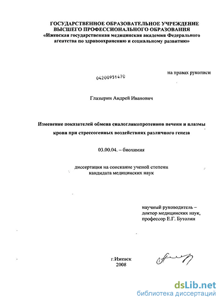 Апробация работы. Основные положения работы представлены на Всероссийской конференции «КомпенсЕггорно-приспособительные процессы» (Новосибирск, 2004); межрегиональной научно-практической конференции, посвященной 85-летию Самарского государственного медицинского университета «Новая идеология в единстве фундаментальной и клинической медицины» (Самара, 2005); 6 Всероссийской конференции с международным участием «Механизмы функционирования висцеральных систем» (Санкт-Петербург, 2008), совместном научном заседании сотрудников кафедр биохимии, нормальной физиологии, патофизиологии, клинической биохимии и лабораторной диагностики, биологии с экологией (Ижевск, 2008).