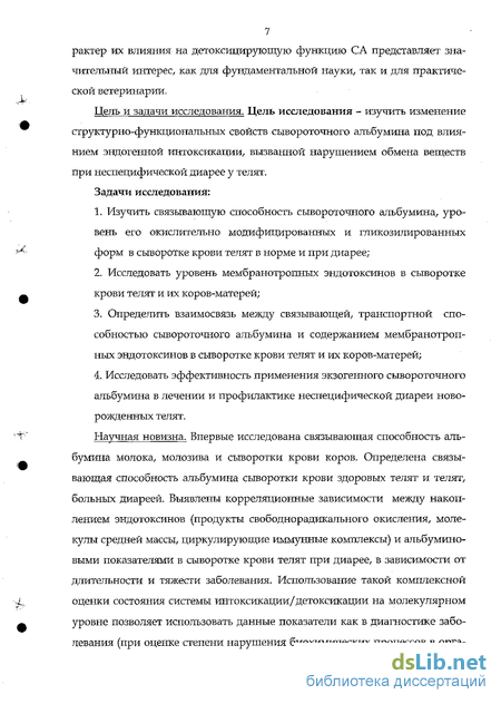 Цель и задачи исследования. Цель исследования - изучить изменение структурно-фушщионалъных свойств сывороточного альбумина под влиянием эндогенной интоксикации, вызванной нарушением обмена веществ при неспецифической диарее у телят.