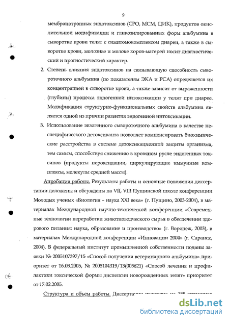 Апробация работы. Результаты работы и основные положения диссертации доложены и обсуждены на VII, VIII Пущинской школе конференции Молодых ученых «Биология - наука XXI века» (г. Пущино, 2003-2004), в материалах Международной научно-технической конференции «Современные технологии переработки животноводческого сырья в обеспечении здорового питания: наука, образование и производство» (г. Воронеж, 2003), в материалах Международной конференции «Инновации 2004» (г. Саранск, 2004). В федеральный институт промышленной собственности поданы заявки № 2005107397/15 «Способ получения ветеринарного альбумина» приоритет от 16.03.2005, № 2005104319/13(005621) «Способ лечения и профилактики токсической формы диспепсии новорожденных телят» приоритет от 17.02.2005.