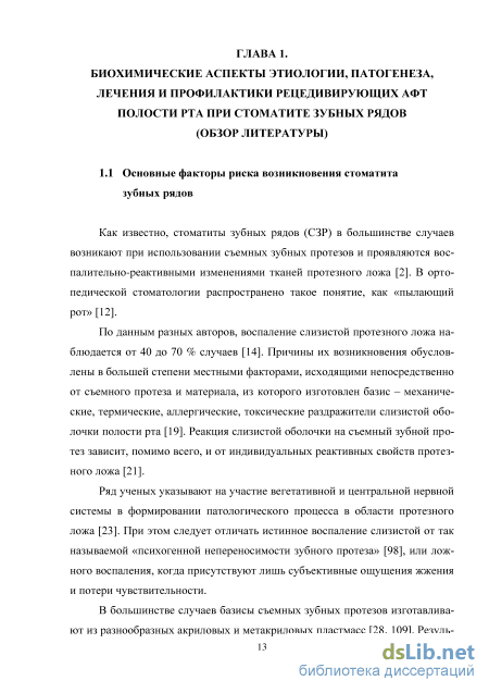 ГЛАВА 1. Биохимические аспекты этиологии, патогенеза, лечения и профилак тики рецедивирующих афт полости рта при стоматите зубных рядов (обзор литературы) 13