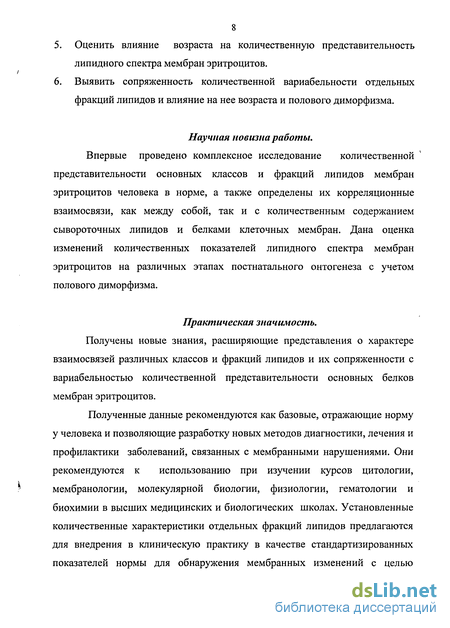 Впервые проведено комплексное исследование количественной представительности основных классов и фракций липидов мембран эритроцитов человека в норме, а также определены их корреляционные взаимосвязи, как между собой, так и с количественным содержанием сывороточных липидов и белками клеточных мембран. Дана оценка изменений количественных показателей липидного спектра мембран эритроцитов на различных этапах постнатального онтогенеза с учетом полового диморфизма.