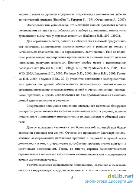 Для нормального роста, развития и обеспечения высокой продуктивности животных, аминокислоты должны находиться в рационе не только в необходимом количестве, но и в определенном соотношении. Ещё не полностью решен вопрос нормирования протеинового и аминокислотного питания интенсивно растущих животных. Поэтому особое место в исследованиях последних лет (Boisen S., 2000; Bellego L.L., 2002; Махаев Е.А. 2005; Dean W.D. 2005; Рядчиков В.Г., 2006; Fastinger N.D., 2006; Stein Н.Н., 2007; Головко Е.Н. 2009; Голушко В.М., 2010) отводится накоплению экспериментальных данных по уровню обеспеченности незаменимыми аминокислотами организма интенсивно откармливаемых свиней с учетом концепции «идеального» протеина, с целью использования их для прогнозирования аминокислотной ценности кормов и рационов.