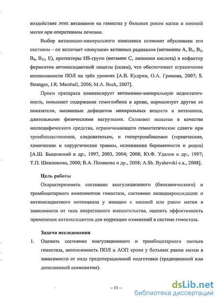 1. Оценить состояние коагуляционного и тромбоцитарного звеньев гемостаза, интенсивность ПОЛ и АОП крови у больных раком матки в зависимости от вида предоперационной подготовки (традиционной или дополненной селмевитом).