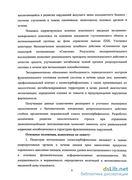 Научно-практическая значимость. Установлен и уточнен один из патогенетических механизмов действия полихлорированных бифенилов, заключающийся в развитии нарушений ведущего звена оксидантного баланса - системы глутатиона в тканях семенников, акцессорных половых органов и печени.