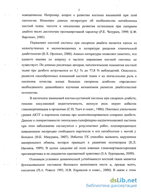 Большая социальная значимость СД заключается в ранней инвалидизации и летальности в связи с поздними осложнениями. Метаболические нарушения, сосудистые и неврологические осложнения СД приводят к развитию изменений практически всех органов и тканей (М.И. Балаболкин, 2000; М.Г. Давыдович и соавт., 2009). Среди них значительное место занимают поражения костной ткани (С.Н. Ткач и соавт., 1986; Н.В. Савинова, 2004). Потеря минеральных компонентов и изменения костной ткани признаны хроническим осложнением СД (В.Л. Орленко, 2000; Я.В. Гирш, 2003).