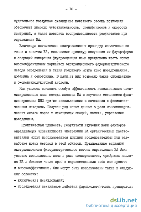 Цель работы: Оптимизация экстракционного флуориметрическо-го метода количественного определения норадреналина (НА), доф амина (ДА) и серотонина (5-окситриптамина - 50Т) в ткани головного мозга крыс с целью создания эффективного рутинного метода и апробирование его в исследованиях функциональной роли этих соединений в ЦНС.