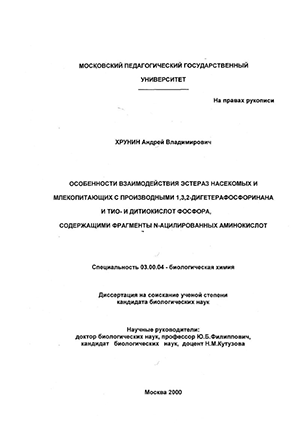 Апробация работы. Материалы диссертации докладывались на III международной конференции по городским вредителям (Прага, 1999), XXVII межвузовской научно-практической конференции по проблемам биологии и медицинской паразитологии, посвященной памяти академика Е.Н.Павловского (Санкт-Петербург, 2000), фосфорорганическом коллоквиуме в ИНЭОС РАН (Москва, 2000), 13-м европейском заседании SOVE (Анкара, 2000), на заседаниях Методической комиссии НИИ дезинфектологии МЗ РФ (Москва 1999,2000).
