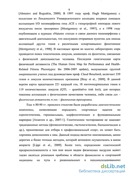 коллегами из Лондонского Университетского колледжа впервые показали ассоциацию I/D полиморфизма гена АСЕ с гипертрофией миокарда левого желудочка после тренировки [Montgomery et ah, 1997], а в 1998 году опубликовали в журнале «Nature» статью о связи данного полиморфизма с двигательной деятельностью, что послужило отправным пунктом для поиска ассоциаций других генов с различными «спортивными» фенотипами [Montgomery et al., 1998]. В настоящее время во многих лабораториях мира проводится поиск генетических локусов, влияющих на фенотипы, связанные с физической деятельностью человека. Последняя генетическая карта физической активности (The Human Gene Map for Performance and Health-Related Fitness Phenotypes: the 2006-2007 update), выпущенная группой американских ученых под руководством проф. Claud Bouchard, включает 239 генов и локусов количественных признаков [Bray et al., 2009]. В данной версии карты представлен 221 ядерный ген, 18 митохондриальных генов и 119 количественных локусов (QTL - quantitative trait loci), для которых показана ассоциация с физическими качествами человека, либо связи ген — физическая активность и ген — физическая тренировка.