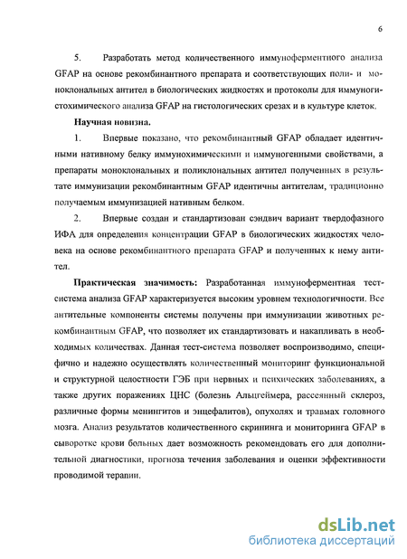 GFAP на основе рекомбинантного препарата и соответствующих поли- и мо-ноклональных антител в биологических жидкостях и протоколы для иммуноги-стохимического анализа GFAP на гистологических срезах и в культуре клеток.