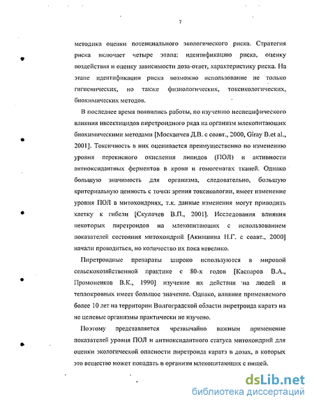 Тем не менее, пиретроиды разными путями в низких концентрациях могут попадать в организм млекопитающих и человека [Эйхлер В., 1993, Aldridge W.N., 1990, Forshow P.J., Ray D.E., 1990, Ripley B.D. et al., 2001]. В связи с этим, они могут рассматриваться как факторы малой интенсивности, потенциальную опасность которых оценить очень сложно. На современном этапе наиболее перспективным подходом к ршению подобных проблем гигиены окружающей среды является методика оценки потенциального экологического риска. Стратегия риска включает четыре этапа: идентификацию риска, оценку воздействия и оценку зависимости доза-ответ, характеристику риска. На этапе идентификации риска возможно использование не только гигиенических, но также физиологических, токсикологических, биохимических методов.