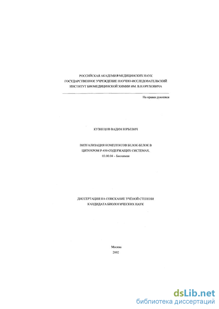 Кузнецов Вадим Юрьевич. Визуализация комплексов белок-белок в цитохром Р-450-содержащих системах : диссертация ... кандидата биологических наук : 03.00.04.- Москва, 2002.- 141 с.: ил. РГБ ОД, 61 03-3/302-3